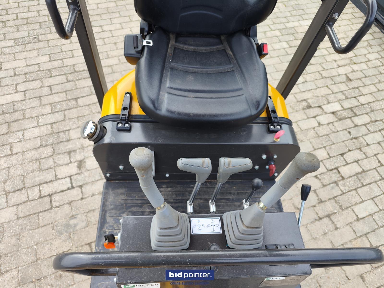 1.2tons WCM Minigraver met bak en rippertand. Specificaties: CTX8010 Hydrauliek druk: 16 Mpa Hydrauliek flow: 16.8 L/min Max. Hijsvermogen: 500kg Hydrauliek koeler aanwezig met extra functie Kleur: geel Eigen gewicht: 1200 kg Rijwerk: rupsen Rijsnelheid: 1.5 km/u Volume schepbak: 0.02 m³ Max. graaf diepte: 1745 mm Max. stort hoogte: 1919 mm Max. graaf radius: 3017 mm Max. graaf hoogte: 2842 mm Afmeting: 2150 x 950 x 1600 (hxbxl)